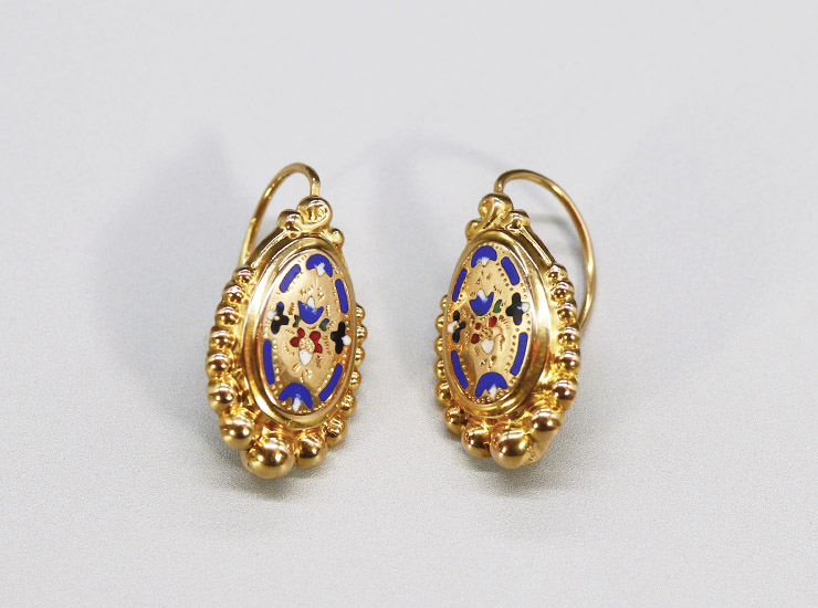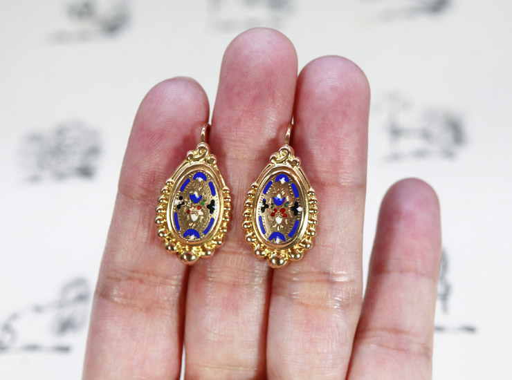 1890年頃のフランス製。現在では入手困難になってしまったデザイン性の高いアンティークピアスです。青、赤、白、緑のエナメルで小さな草花が描かれた可憐でありながら華やかなデザイン。縁の粒状の装飾は下にいくにつれてだんだん大きくなり、立体的な陰影が綺麗に表現されています。