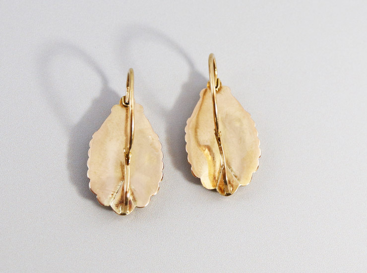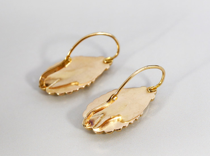 ピアスにフランスの18金のホールマーク(馬の頭)入り。エナメルに僅かな色の剥がれ、粒の装飾の間(掲載写真の矢印で示した箇所)に非常に小さな穴がありますが、アンティーク18金エナメルピアスは全体的に良い状態です。
