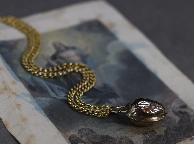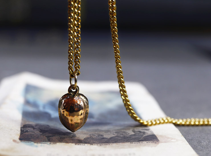 1890年頃のイギリス製。クルミがモチーフの珍しいアンティークゴールドチャームです。固い殻に包まれているクルミは、古くから知性や判断力のシンボルとして知られています。これまで500点を超えるゴールドチャームを集めてきましたが、アンティークのチャームは数えるほどしかありません。その中でもクルミがモチーフのチャームには初めて出会いました。