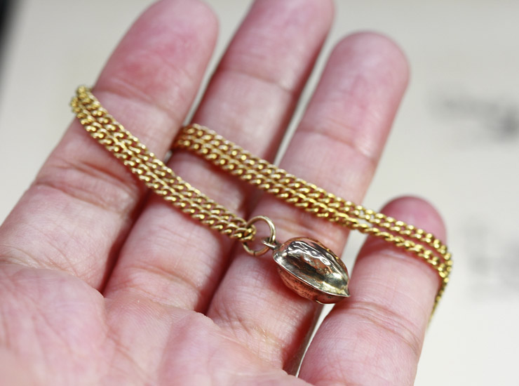 地金は9金イエローゴールド。大きさは縦12.5ミリ×横9.5ミリ。もちろん本物のクルミより小さいですが、凸凹した殻や古いゴールド特有のパティーナ(ゴールド表面の薄く黒くなった部分)がリアルで味わいが感じられます。中は空洞の作りで軽量です。