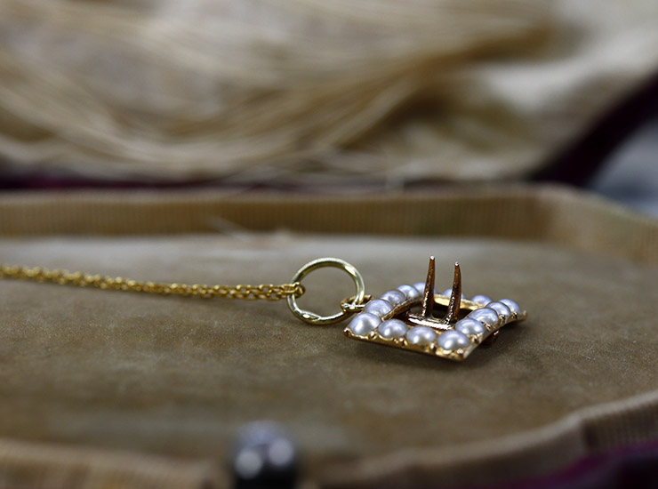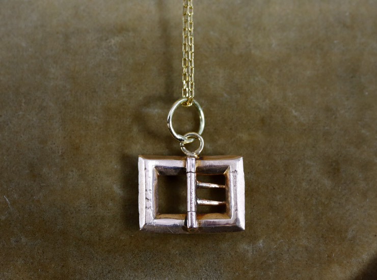 1900年頃のアメリカ製。指先に乗る程の小さなバックルをペンダントにお仕立ていたしました。こちらのミニチュアバックルは、サイズこそとても小さいのですが、真ん中の爪金具が本物のように動く凝った作りになっています。元々はクラバットピンの装飾もしくはもっと大きなジュエリーの一部だったと思われます。その美しいパーツを生かすべく、熟練の職人さんにお願いしてペンダントにしていただきました。