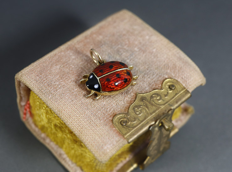 1950年のイギリス製ヴィンテージチャームです。幸運のシンボルとして親しまれてきたテントウムシモチーフ。作られてから75年とかなり古いチャームですが、驚くほどエナメルの状態が良好です。細部まで丁寧に作り込まれており、当時のヴィンテージチャームの中でも作りの良さが際立っています。丸く立体的な羽に、艶のある赤のエナメル、そして小さな黒の斑点と美しいディテールの詰まった丁寧な作りは、子供っぽくならず、愛らしい大人のジュエリーとしておすすめです。