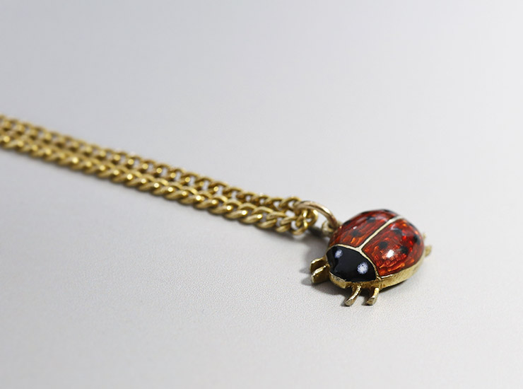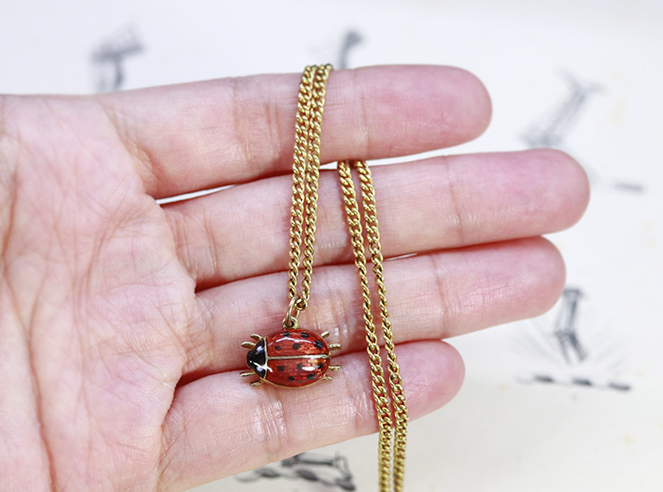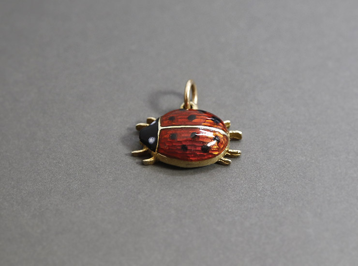 地金は9金。サイズは縦9.5mm × 横16mmと一般的なヴィンテージてんとう虫チャームよりも少し大きめです。本物のテントウムシより一回りほど大きく、さりげなくも存在感があります。テントウムシをモチーフにしたチャームは、シンプルに丸い羽だけをかたどった脚のないデザインが多い中で、こちらは古いものらしい少し変わった個性的な形が魅力です。幸運を運んでくれそうな美しいラッキーチャームです。