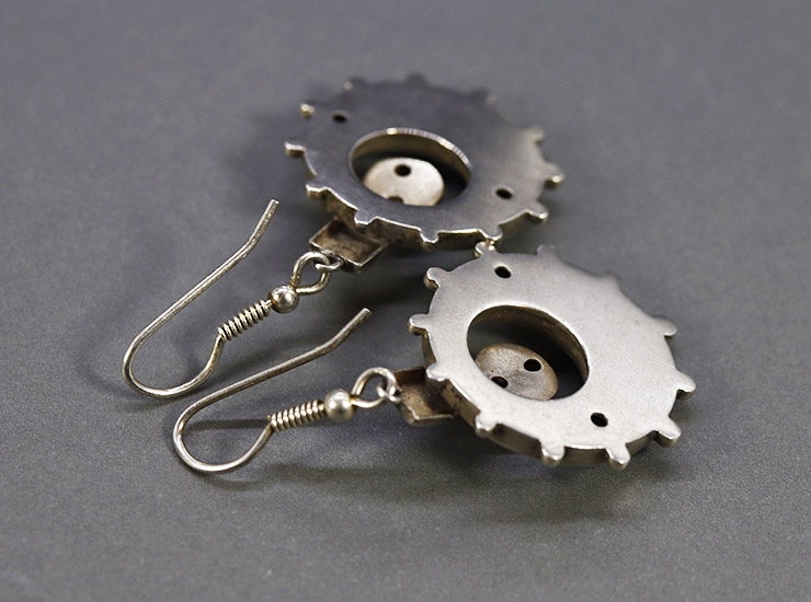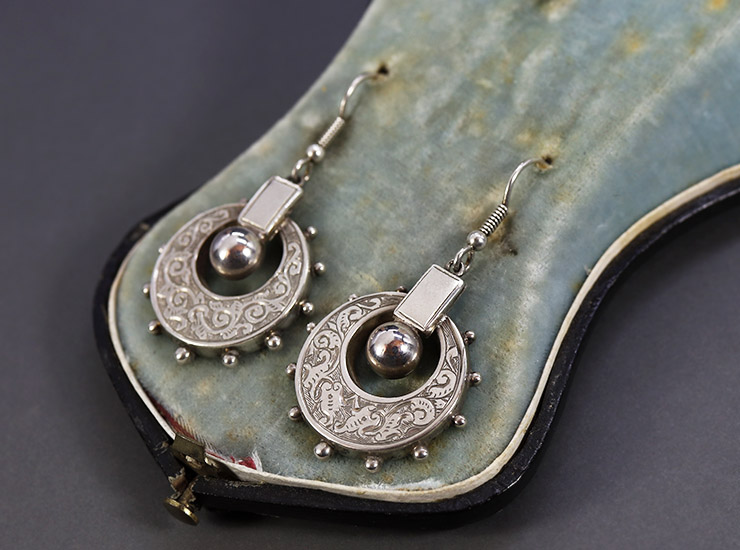 1880年頃のイギリスで作られた、ヴィクトリアンシルバーピアス。フック部分のみ現代のものに付け替えられていますが、下の装飾部分は当時のオリジナルです。装飾部分は、もとより大きなイヤリングやジュエリーの一部だった可能性があります。当時の職人の技巧が凝縮されたパーツを現代的にピアスへと仕立て直したことで、アンティークの存在感を残しつつも、軽やかで着けやすいサイズ感に仕上がっています。