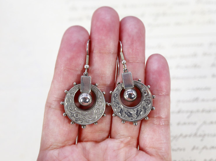 装飾部分のサイズは縦26ミリ × 横23ミリ。フックまで含めた全長は約45ミリ。存在感を放ちながらも大ぶりすぎないので、カジュアルなスタイルにも合わせやすい、ヴィクトリア時代の美しいドロップピアスです。