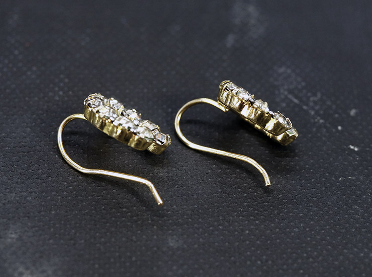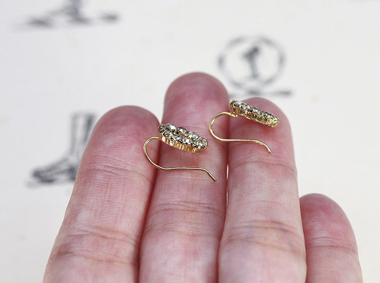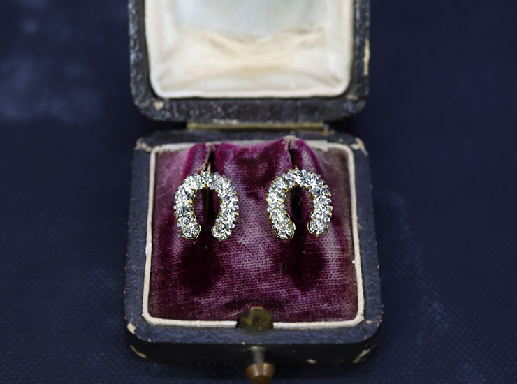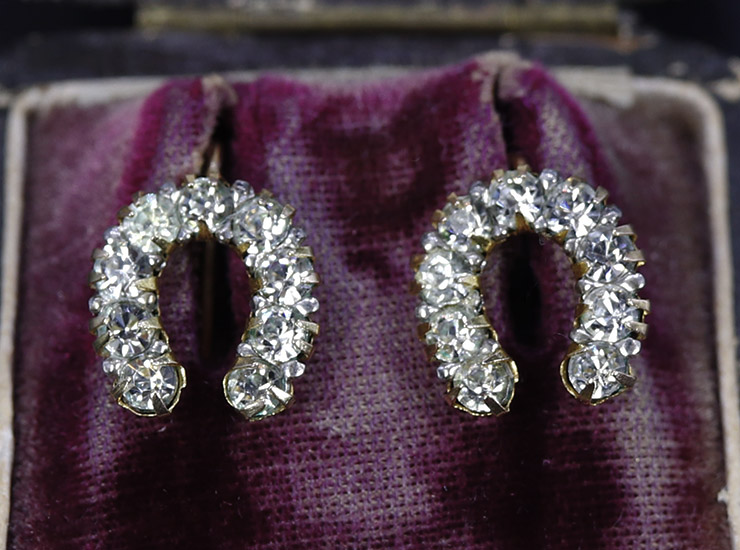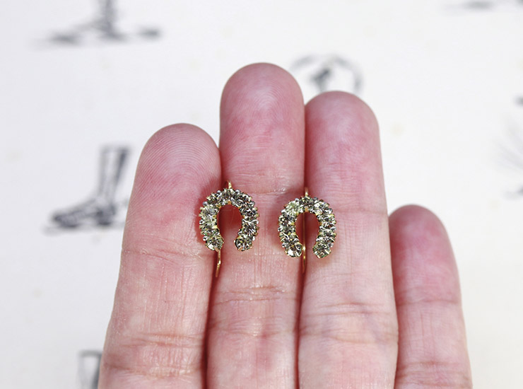 1930年頃のイギリス製。幸運を呼ぶモチーフのホースシューがモチーフのアンティークピアスです。ホースシューの表面にセットされているのはオールドカットの小さなペースト(ガラス)です。ペーストといえど、光に当たると美しい輝きを見せてくれます。