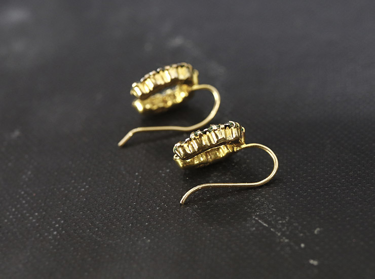 地金は9金イエローゴールド。モチーフのサイズは縦10ミリ×横9ミリ。モチーフ裏のゴールドには「9CT」と9金の刻印以外に、当時の特許番号(PAT483401)が入っており、これは小さなペーストをカップ状の台座に収め、均一に美しく留めるための技術で、1930年代当時の新しいセッティング方法でした。