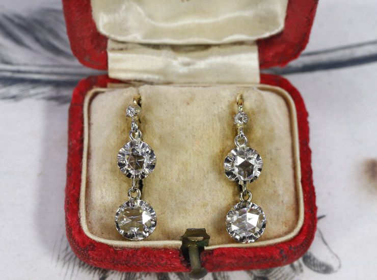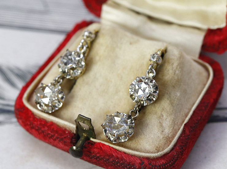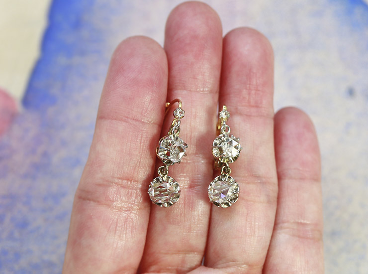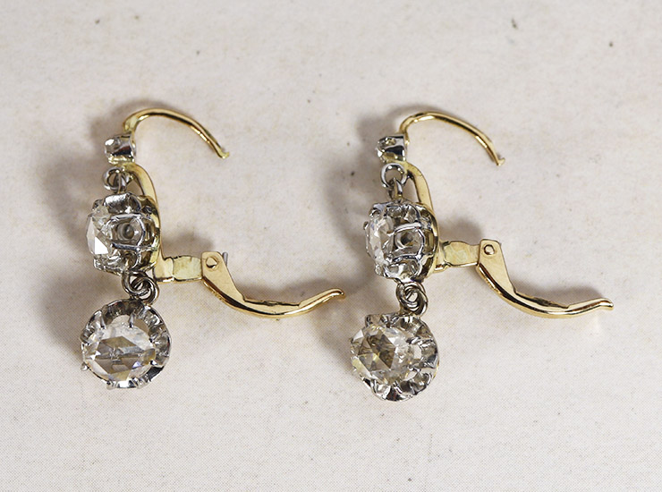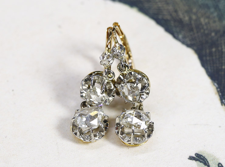 1900年頃のフランス製アンティークダイヤモンドピアスです。縦に三石のダイヤモンドが並び、ゆらゆらと優美に揺れ動きます。ダイヤモンドはすべてローズカット。アンティーク特有のローズカットで、表面積を広く取りながら厚みを抑えたフラットな形状をしており、水分を含んだようにうるうるとした輝きを放ちます。ハンドカットのダイヤモンドですので、大体のサイズとなりますが、下の一番大きなダイヤモンドは縦5ミリ×横6ミリ、中央は縦5ミリ×横4ミリ、上は直径1.5ミリと大きさが異なり、圧巻の存在感を放ちながらキラキラ絶え間なく煌めき、顔まわりを明るく照らします。