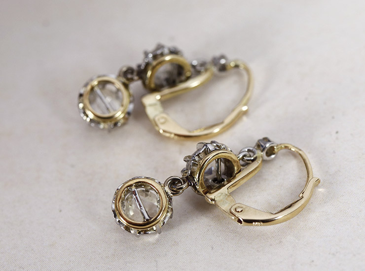 地金は、ダイヤモンドのセッティング部分は18金ホワイトゴールドで、ピアス全体は18金イエローゴールド。着用時の全長は約26ミリ。留め具は上下に開閉するレバーバックタイプで、経年により緩みが見られたため、アンティークジュエリー専門の職人によりパーツのみ新品に交換済みです。アンティークの趣を損なうことなく、安心して末永くご使用いただけるよう、専門の職人が熟練の技術で修復しております。