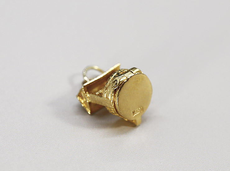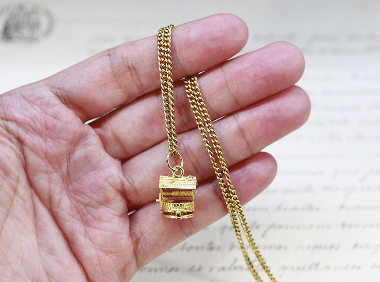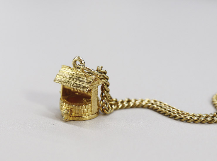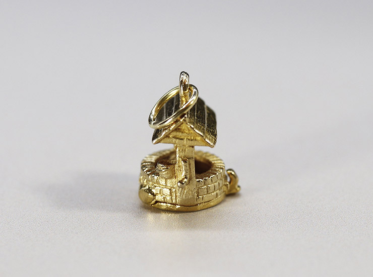チャームの地金は9金。9金にしては18金に近い少々濃い色合いのゴールドです。チャームはカチリと音をたて、スムーズに開閉できます。サイズは閉じた状態で縦12ミリ×横11ミリ、重量は3.6グラム。贅沢にゴールドがたっぷりと使用され、手に取るとしっかりとした重みを感じます。井戸の作りは立体的で、蓋を開けると中には小さな猫がちょこんと座っています。少し残酷な歌詞とは裏腹に、井戸の中の猫はゆったりと優雅に座り、なんともユーモラスに表現されたヴィンテージゴールドチャームです。