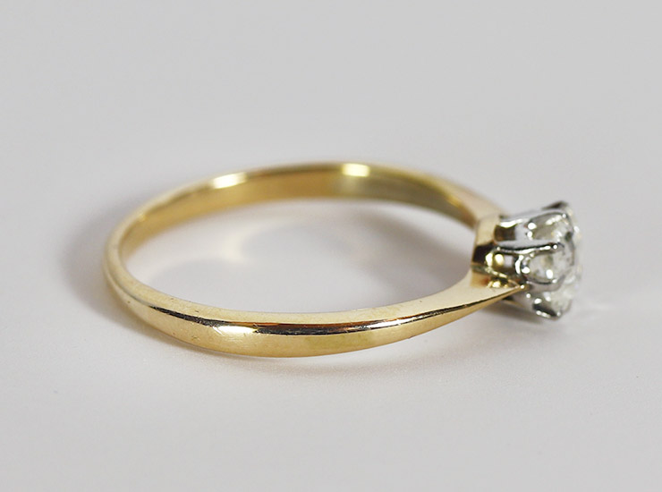 地金は、セッティング部分はプラチナ、リング全体は18金イエローゴールド。シンプルで気品あるデザインは、当時婚約指輪として贈られた可能性が高いものです。