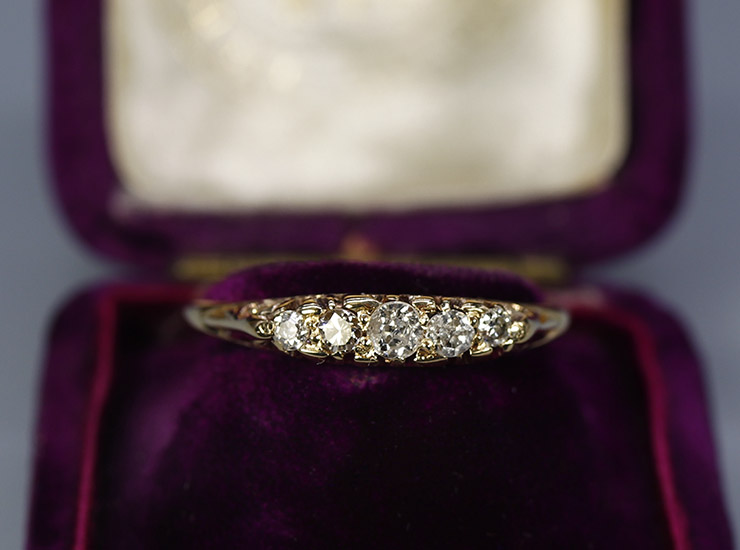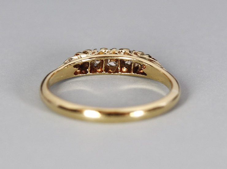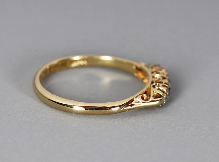 地金は18金。ほんのりピンクを帯びた美しいゴールドです。リングには18金と1916年を示すイギリスのフルホールマーク、そしてメーカーズマーク入り。このような定番の5ストーンリングでフルホールマークが揃うものは決して多くなく、通常は「18ct」などの刻印とメーカーズマーク程度しか刻まれていないことがほとんどです。