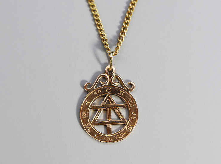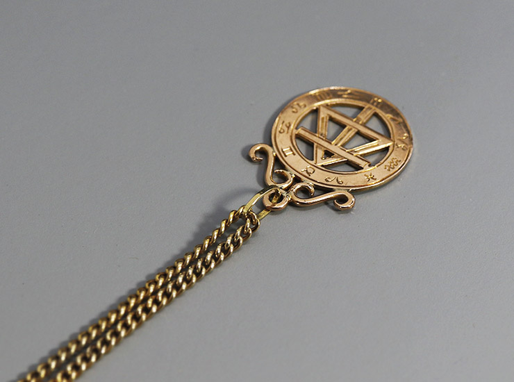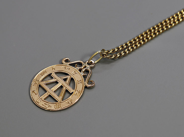1960年代以降、ヒッピー文化などスピリチュアルなムーブメントの中で、西洋占星術は精神的な探求や自己理解の手段として広く受け入れられました。そうした時代の空気を映した神秘的なデザインのペンダントです。