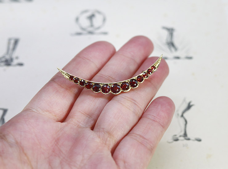 1900年頃のイギリス製アンティークブローチです。しなやかに弧を描く三日月モチーフに、アルマンディンガーネットは先端に向かうにつれ石が小さくなる美しい流れと、中央でいっそう濃く深みを帯びる赤が印象的です。