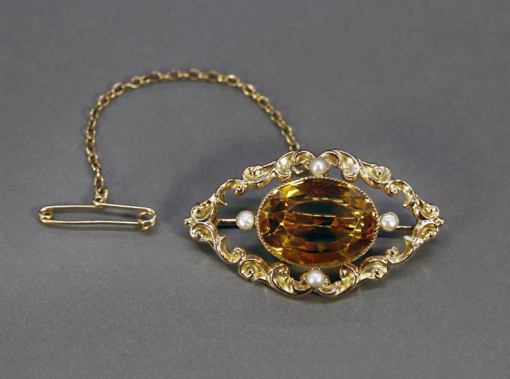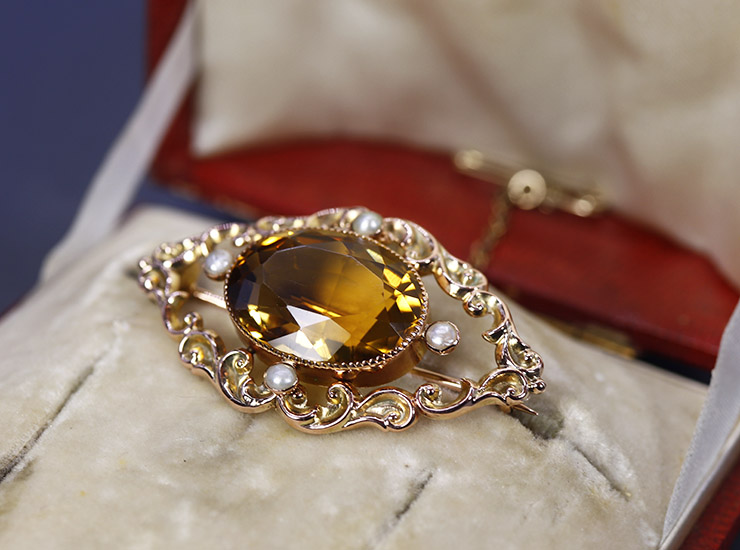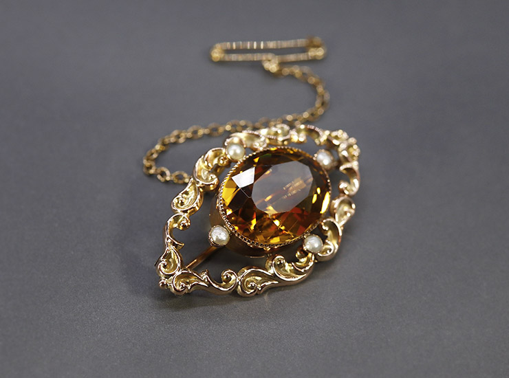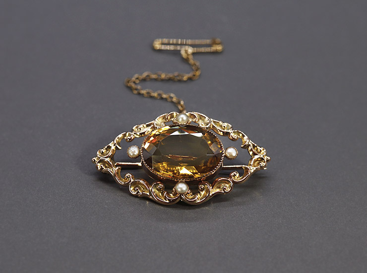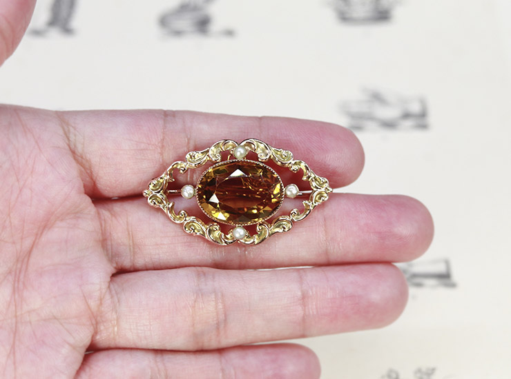 アンティーク9金ゴールド大粒クォーツ・シードパールブローチ