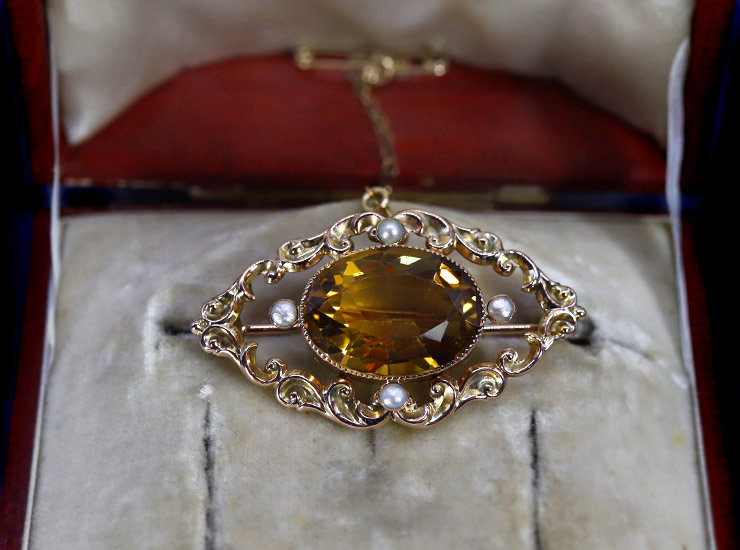 1900年頃のイギリス製アンティークブローチ。中央のオレンジ色の大粒の石は天然クォーツです。クォーツの上下左右に、艶のあるクリーム色のシードパールが配置され、クォーツの美しい彩りを柔らかく引き立てています。フレーム全体を飾るのは、優雅なスクロール装飾です。スクロールとは、もともと渦巻きを意味し、ジュエリーにおいては唐草を思わせる曲線的な装飾モチーフのことを指します。19世紀末から20世紀初頭にかけて、アールヌーヴォー様式の流れるような有機的デザインが広まり、こうした金細工が多く見られるようになりました。