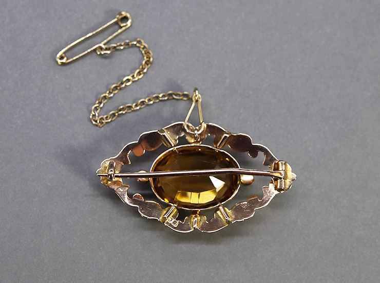 ブローチに「9C」と9金の刻印入り。アンティーク9金大粒クォーツ・シードパールブローチは良い状態です。