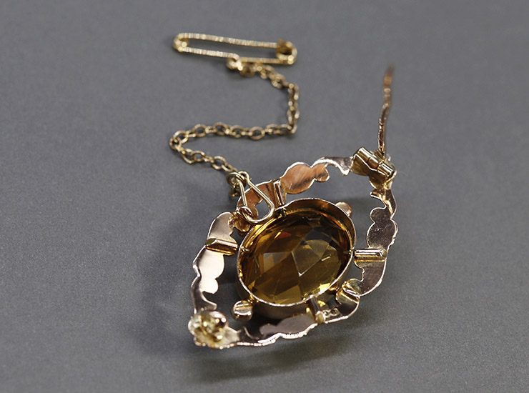 地金は9金。ほんのりピンク色を帯び、9金にしては濃厚な色合いのゴールドです。ブローチのサイズは縦21ミリ×横38ミリ。クォーツのサイズは縦12.5ミリ×横17ミリ。アンティークですので、ピンにわずかな歪みがありますが、しっかり留まり使用にはまったく問題ありません。また、落下防止のチェーン付きのセーフティーピンも付いており、当時の上質なジュエリーに見られる丁寧なつくりがそのまま残されています。
