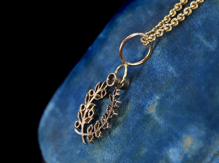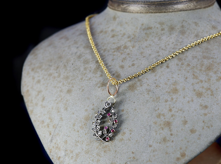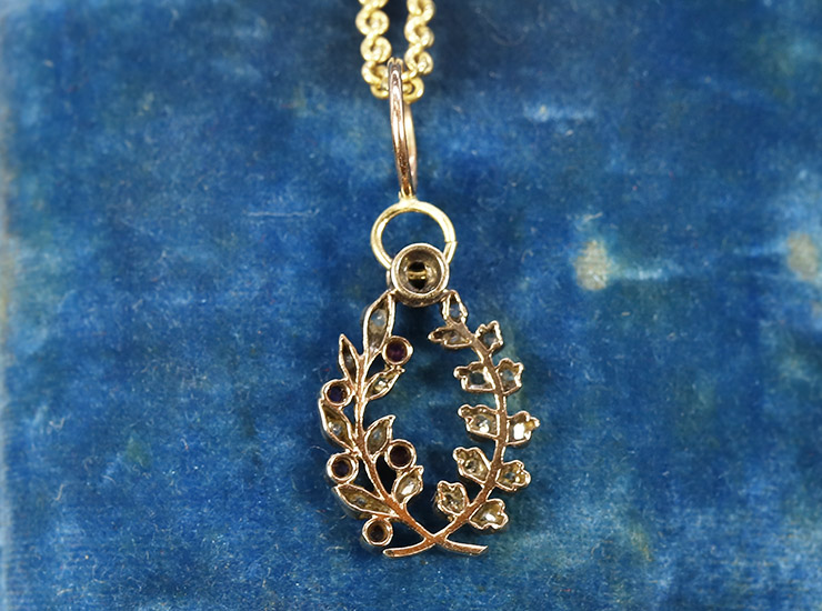 1890年頃のフランス製アンティークペンダントです。小さなガーランドモチーフに、5石の天然ルビーとローズカットダイヤモンドがと敷き詰められています。一石一石は小粒ながらも、ダイヤモンドは光を受けて繊細に煌めき、ルビーは深みのある赤がぴりりと際立つ美しいコントラストが目を引きます。モチーフ部分の大きさは縦18ミリ×横12.5ミリ。バチカンまで含めた全長は29ミリ。