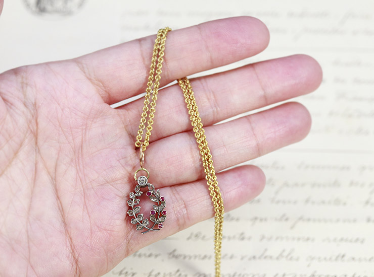 地金は、バチカンは18金で、ペンダント全体はシルバー。ペンダントの裏側は、シルバーに金が被せられたヴェルメイユです。大きめのバチカンはチェーンだけでなく、アンティークリボンやサテンコードも通せるサイズで、シーンに合わせて多彩なアレンジが可能です。小ぶりながらもルビーとダイヤモンドが贅沢にあしらわれ、可憐さと華やかさを兼ね備えたアンティークペンダントです。