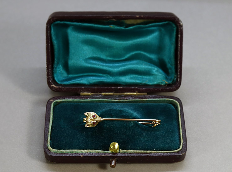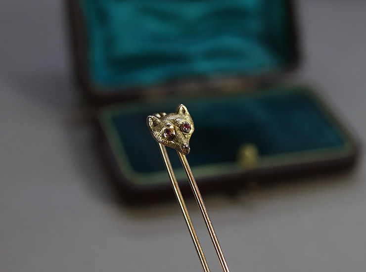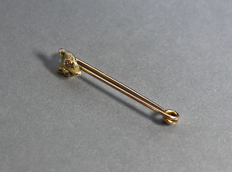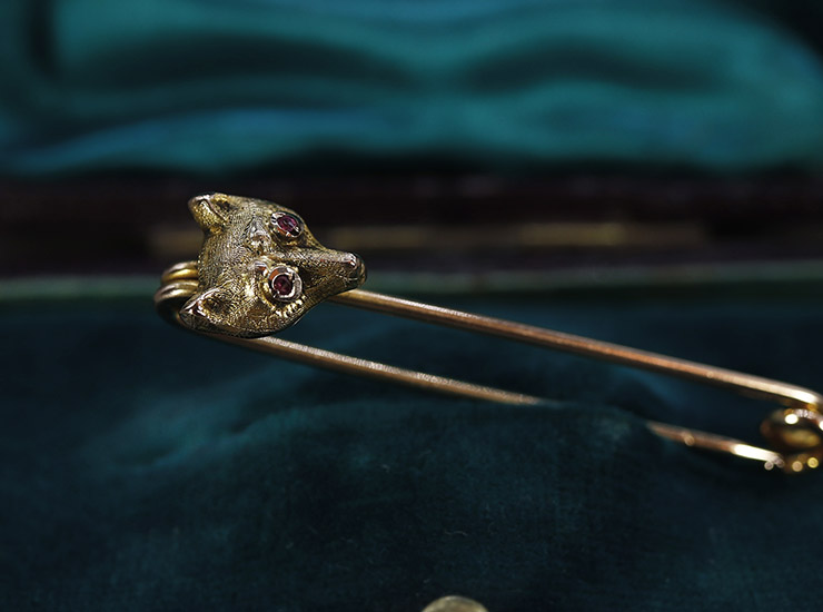 可愛らしさよりも野性味を感じさせる顔立ちは独創的で、ヴィクトリアン期の職人技が息づいています。ユニセックスなデザインで、男性のタイピンとしても、女性のコートやジャケットの襟元、ニットなどにもよく映えます。コレクターの方にもおすすめできる、受け継ぐ喜びを感じられるアンティークジュエリーです。