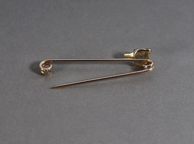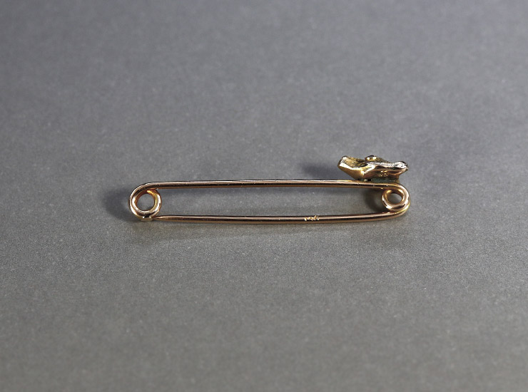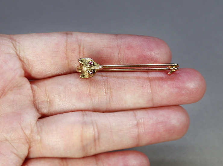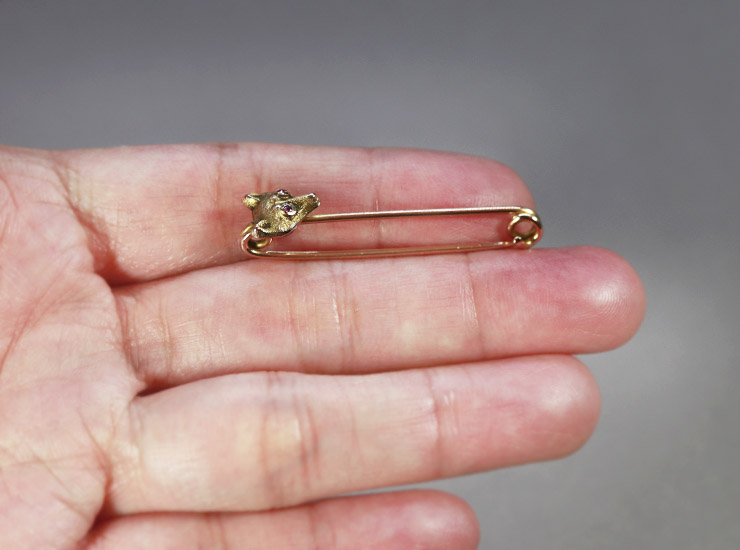 ブローチの地金は、9金イエローゴールド。やや渋みを帯びたゴールドが味わい深い表情をさらに引き立てています。フォックスヘッドのサイズは縦9.5ミリ×横7.5ミリ、ブローチ全体の長さは39.5ミリ。小ぶりで上品なサイズ感です。ピンは安全ピンタイプのシンプルな構造ながら、ピン先が飛び出さない設計で実用性にも優れています。また、日常使いのできるしっかりとした作りも魅力です。